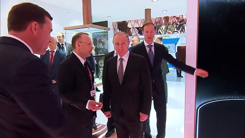 圖:俄羅斯總統(tǒng)普京參觀2017創(chuàng)新工業(yè)展,腳下這塊地磚屏是優(yōu)景BOS系列