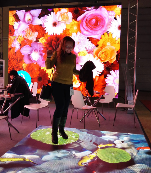 優(yōu)景展位最吸睛的產(chǎn)品非互動(dòng)地磚屏莫屬。作為全球互動(dòng)地磚屏領(lǐng)導(dǎo)品牌,優(yōu)景推出的具有行業(yè)領(lǐng)先地位的互動(dòng)地磚屏,內(nèi)置人機(jī)互動(dòng)傳感系統(tǒng),可以實(shí)現(xiàn)人屏完美互動(dòng),極具視覺沖擊力,能顯著提升活動(dòng)科技感和宣傳效果,特別適用于舞臺(tái)、劇場、劇院等應(yīng)用場景造型,產(chǎn)品深受歐美客戶的喜愛和好評(píng)。同時(shí)配套多款自主研發(fā)的互動(dòng)游戲,輕松實(shí)現(xiàn)多種人機(jī)要求,讓顯示屏具有生命。
